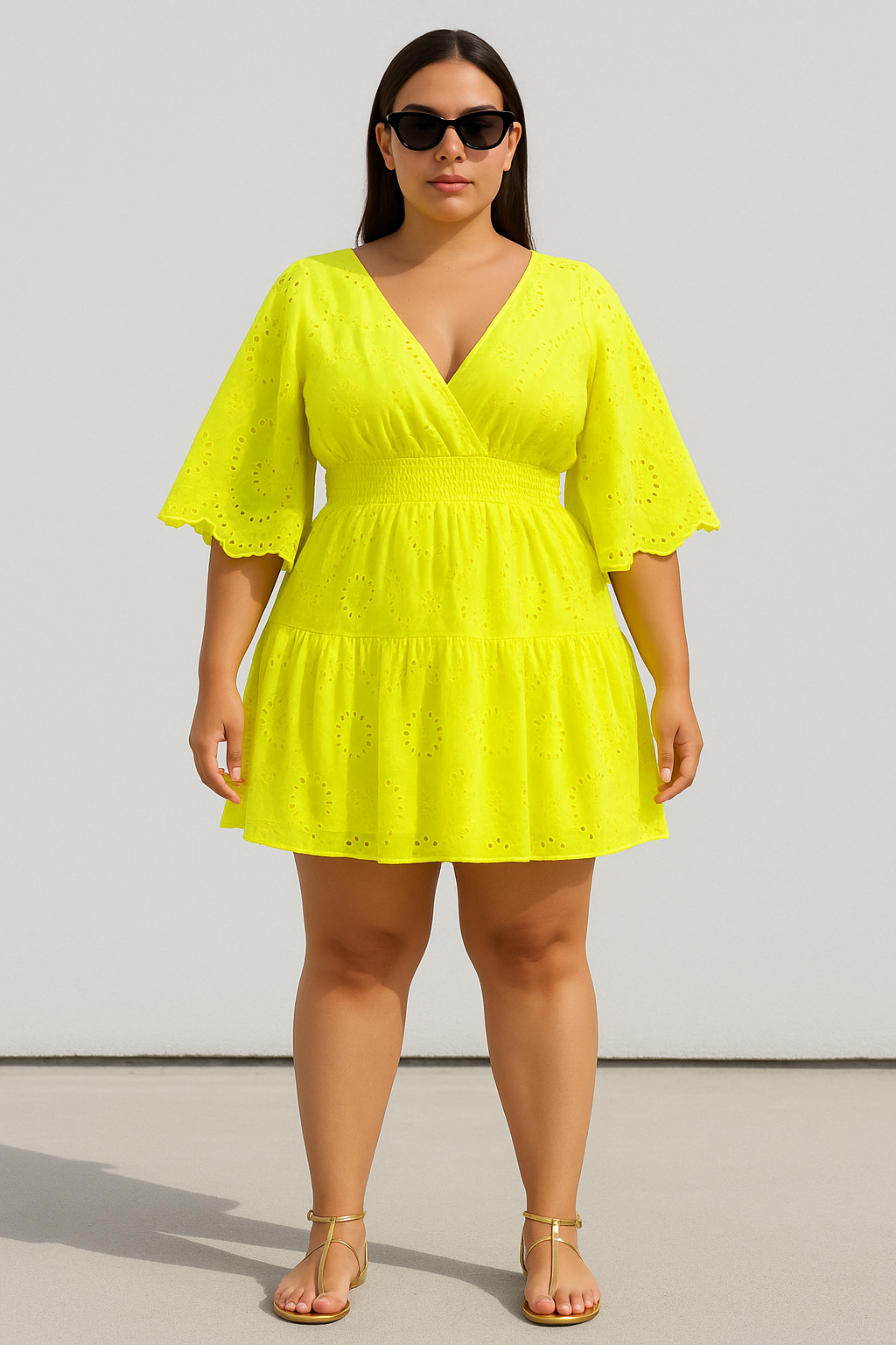 Ludique et radieux — avec des manches flottantes, une taille cintrée flatteuse et un tissu à œillets aéré pour un style ensoleillé